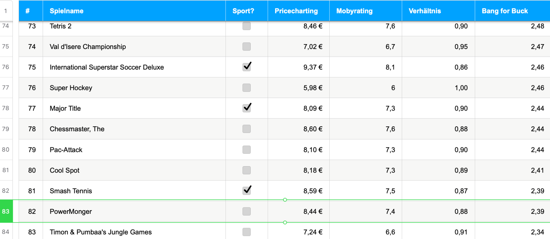 Ich denke schon, dass man die 10 Games dieser Liste relativ günstig kriegt: Zwar nicht für die 64 €, die pricecharting.com vorschlägt, aber unter 100 € sollten drin sein. Spannend wird es auch, wenn wir die Mindestbewertung von 7 auf 8 setzen oder schauen, welche supergünstigen Sportspiele eigentlich ziemlich gut sind. Damit beschäftige Ich mich dann mal in einem zukünftigen Blogpost.
