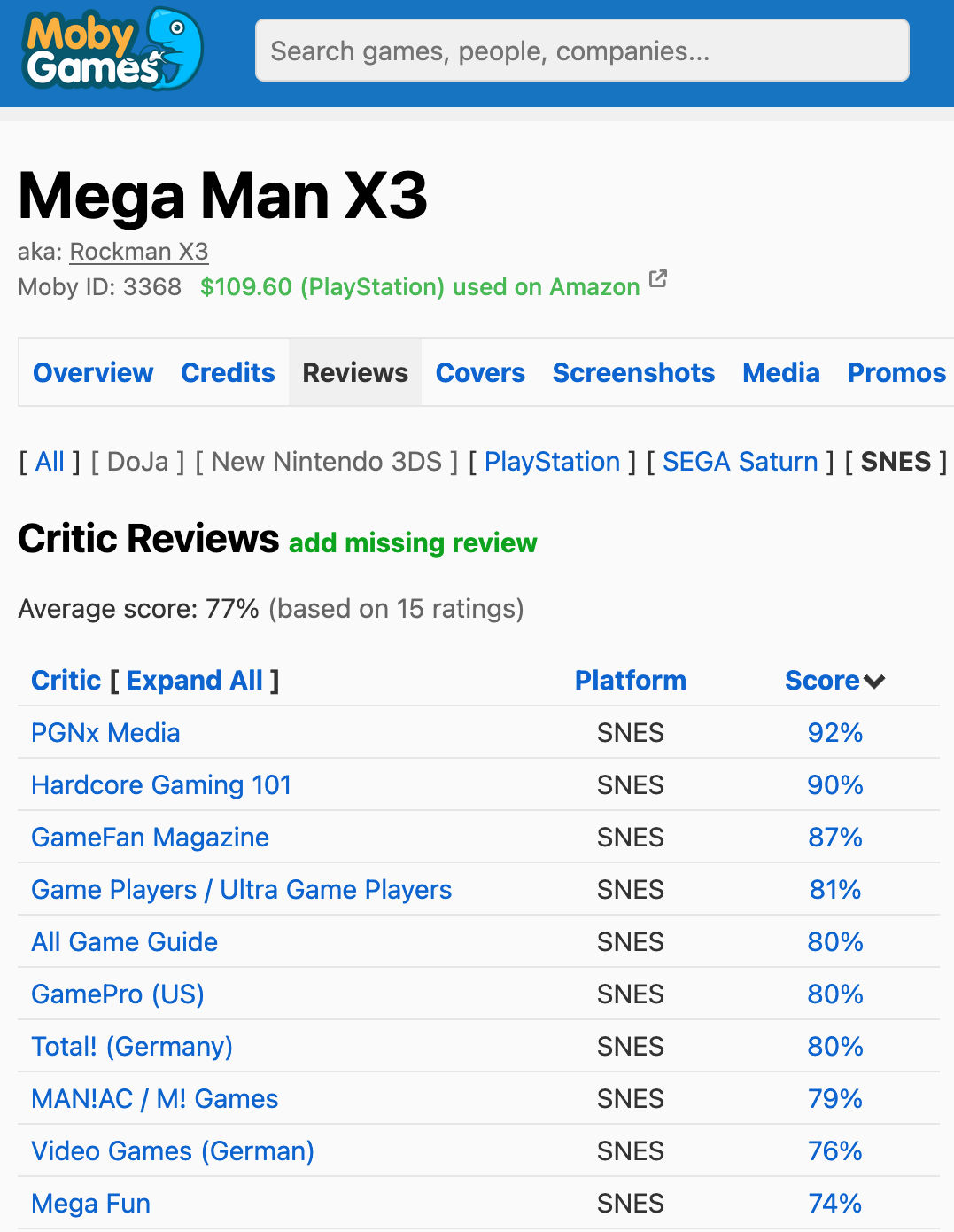 Schließlich brauchen wir noch die Info, wie gut die eigentlichen Spiele denn so sind. Machen die Games auch Spaß? Da das ein gutes Stück weit auch sehr subjektiv empfunden wird, wäre ein aggregierter Schnitt die beste Wahl. Normalerweise wäre Metacritic hier eine fabelhafte Anlaufstelle – die Seite listet so alte Spiele aber leider nicht. Aber es gibt ja mobygames.com, die aus einer Mischung aus Kritiker- und Spieler-Reviews auch für so alte Games einen Schnitt ermitteln. Und unter den Kritiker-Reviews befinden sich auch erfreulich viele deutsche Magazine der damaligen Zeit, wie die Mega Fun, Video Games oder MAN!AC.