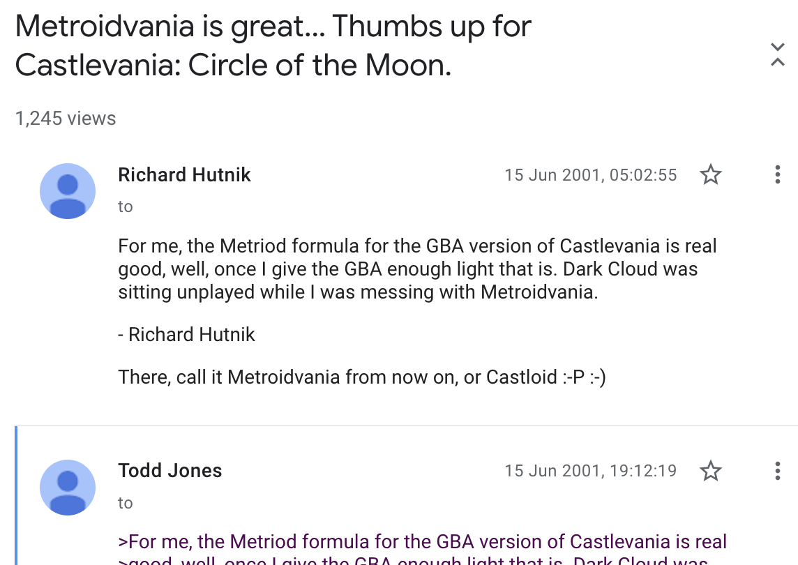 Der eigentliche Begriff Metroidvania stammt nicht – wie ich lange dachte – aus der Feder des Videospieljournalisten Jeremy Parish, wurde aber von ihm und seinen Kollegen bei 1UP populär gemacht. Noch früher wurde in Gaming-Foren darüber diskutiert, wie man die linearen Castlevania-Spiele von den offenen Castlevania-Spielen unterscheiden könne. Dort bezeichnete man die klassischen, levelbasierten Castlevania-Titel einfach als Castlevania und Titel, die wie Symphony of the Night eine offene Spielwelt boten und sich wie Metroid spielten, als Metroidvania. Diese Bezeichnung blieb hängen. Mittlerweile gibt es auch Bemühungen, den Begriff „Search Action“ für das Genre zu etablieren.
